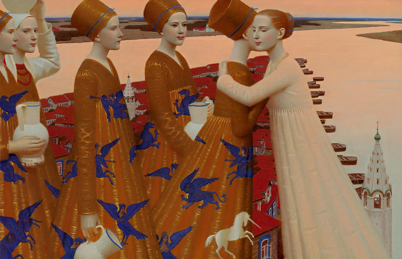 Andrey Remnev (1962) se pasó la juventud copiando a los antiguos maestros en los museos de Moscú. Su obra, profundamente rusa pero universal a la vez se inspira en toda la historia del arte de su país, desde los constructivistas a los iconos medievales rusos, y también la historia del arte universal (el Renacimiento italiano por ejemplo) consigue con ello una pintura atemporal y mágica.