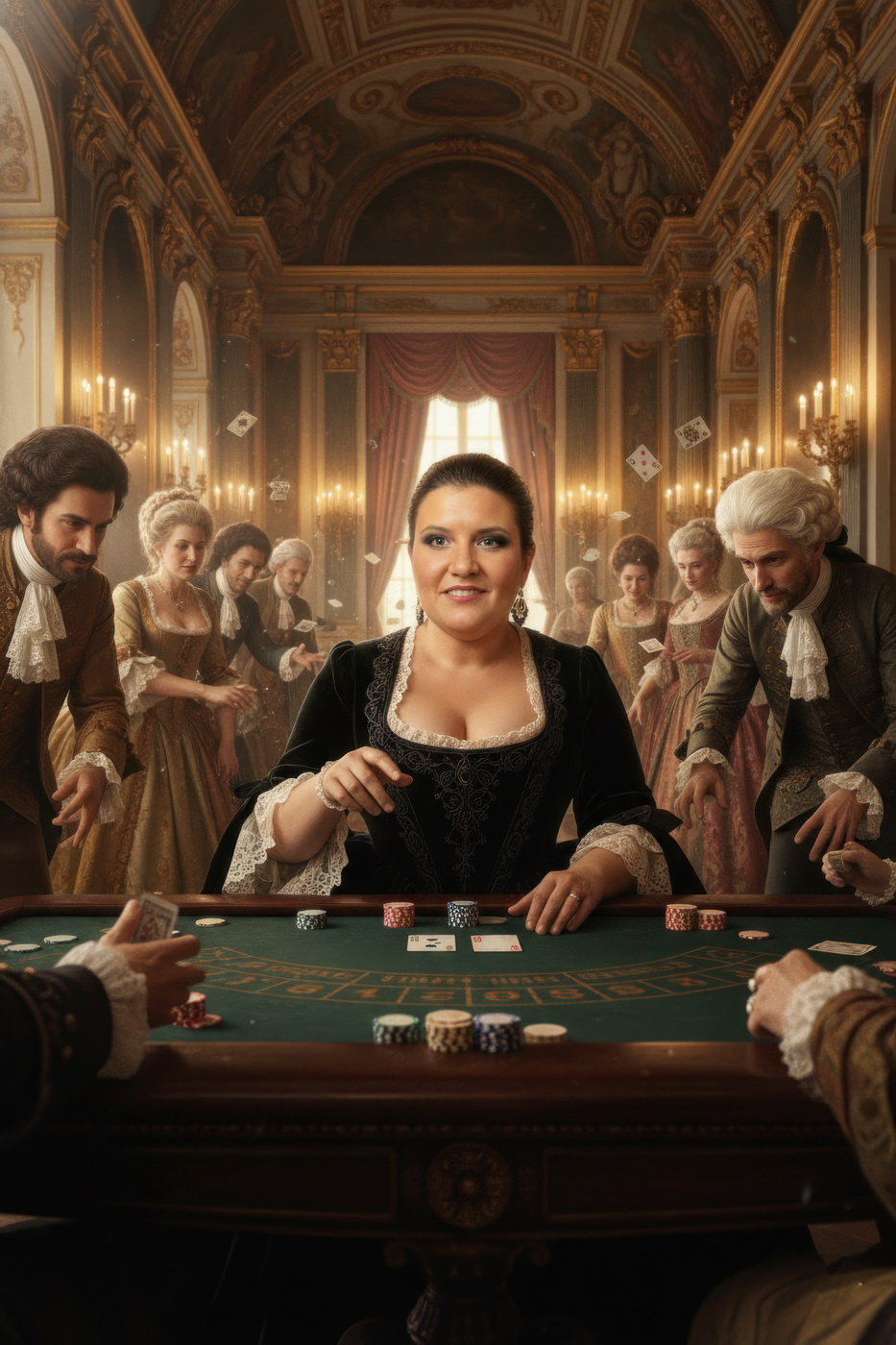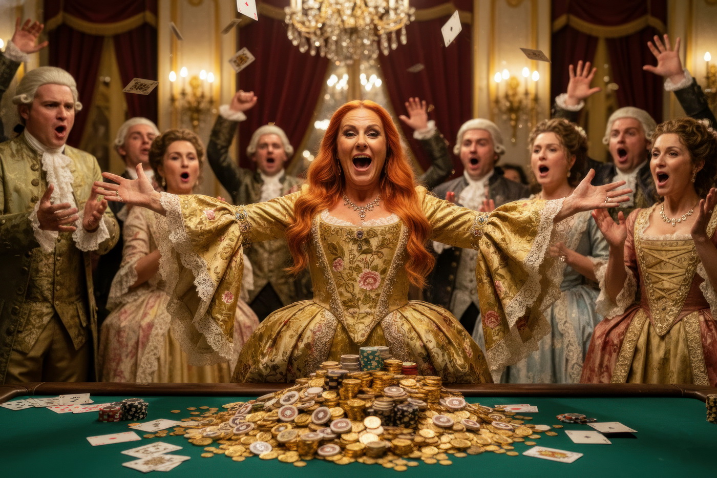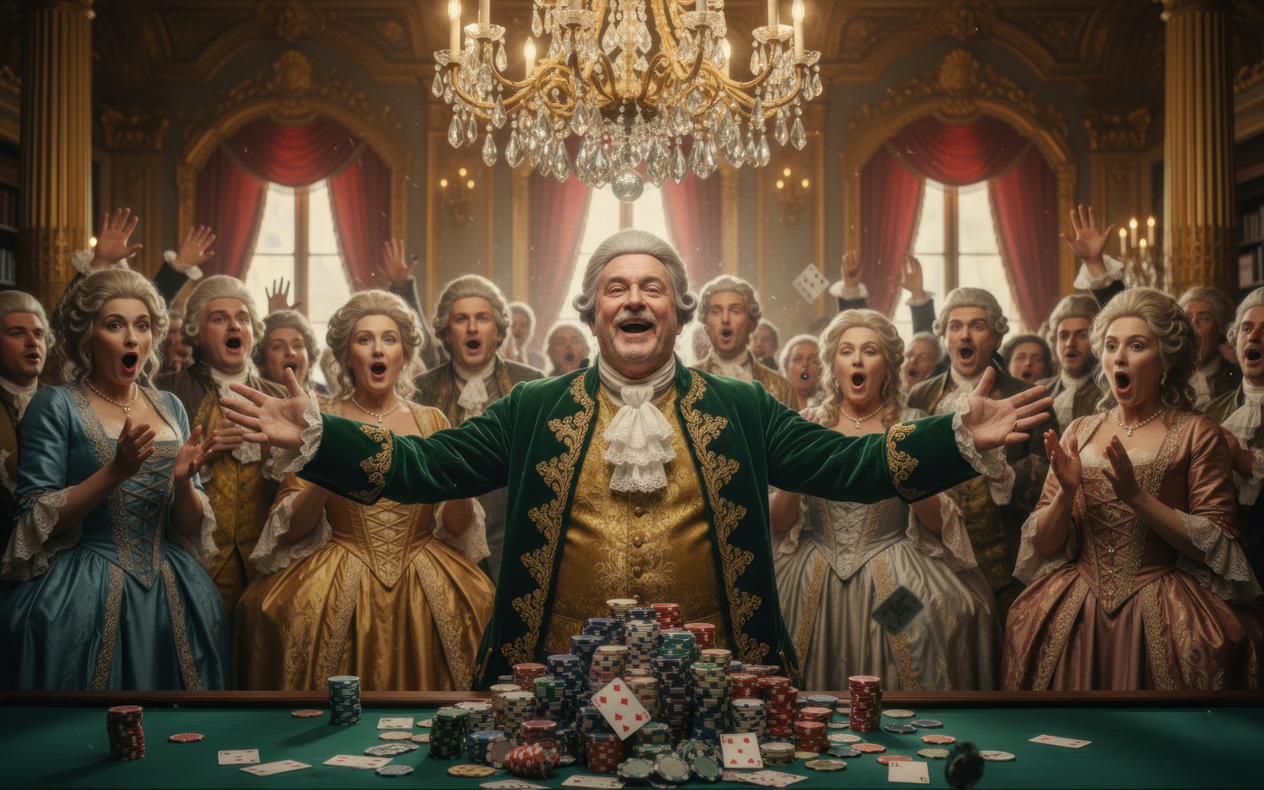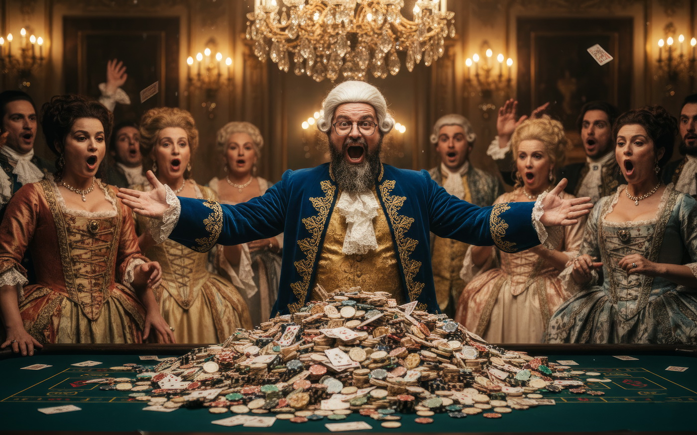 Apostar con peluca y cara de no haber roto un plato. Esto va de casinos pero con la estética de Barry Lyndon, o sea, mesas de juego en salones del siglo XVIII iluminados con velas, gente con pelucas empolvadas apostando fortunas como si fuera lo más normal del mundo y perdiéndolas con la misma calma elegante; el “protagonista espiritual” sería Redmond Barry, un tipo que sube y baja socialmente a base de cartas, suerte y bastante cara dura, y lo curioso aquí es el contraste: todo parece refinado y silencioso… pero en realidad es el mismo vicio de siempre, solo que con mejores modales y ropa mucho más incómoda.