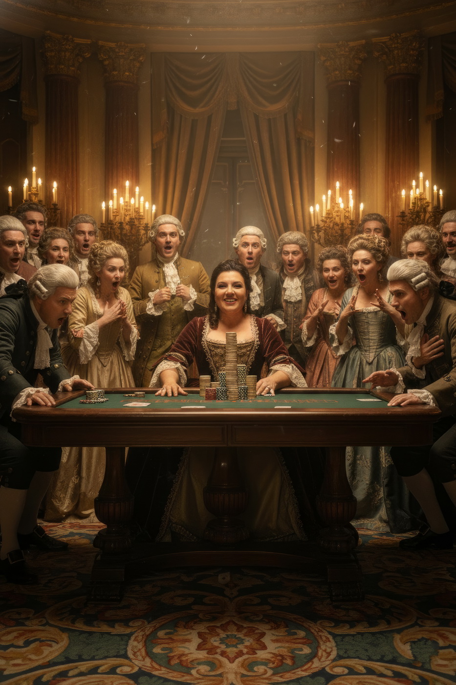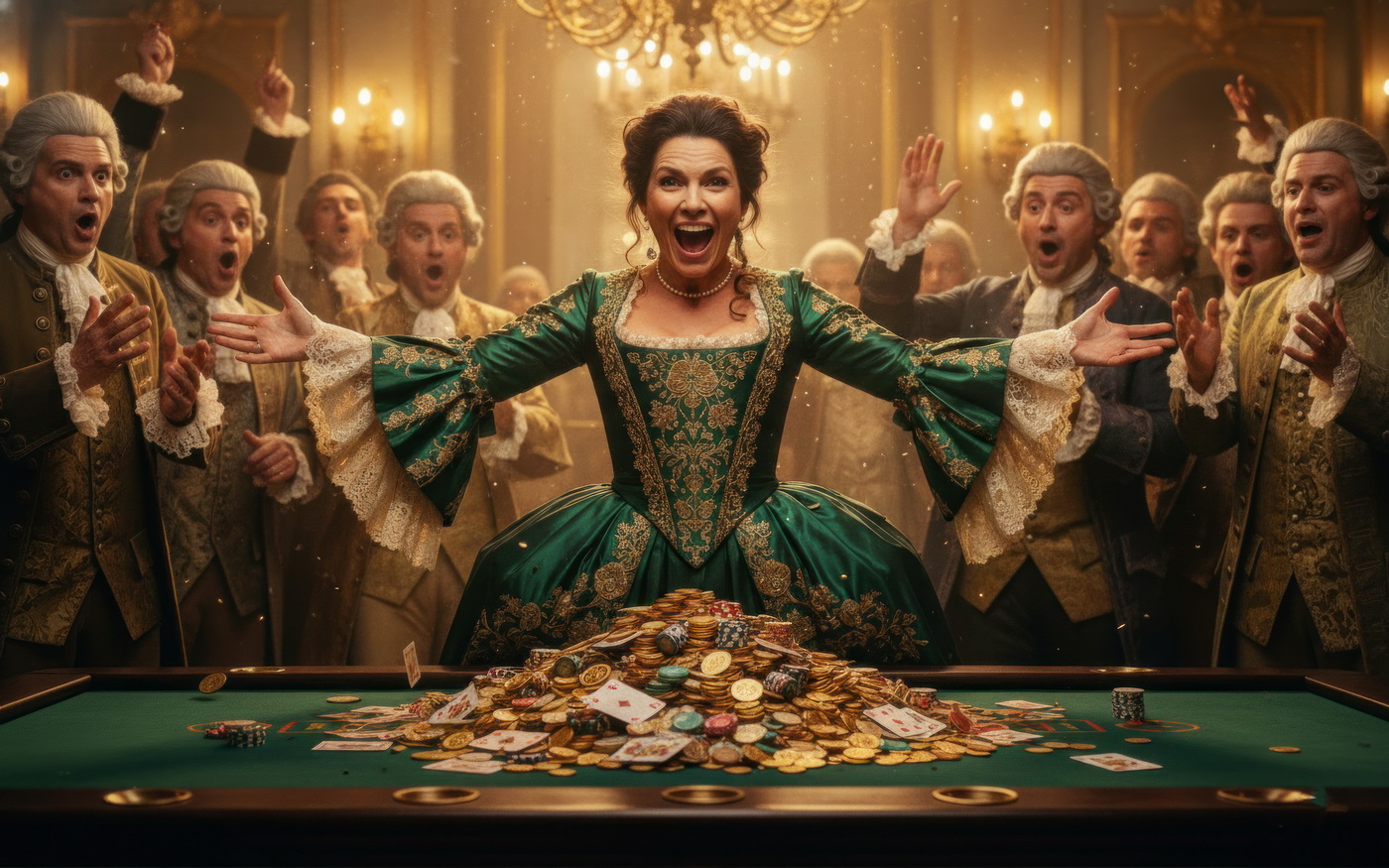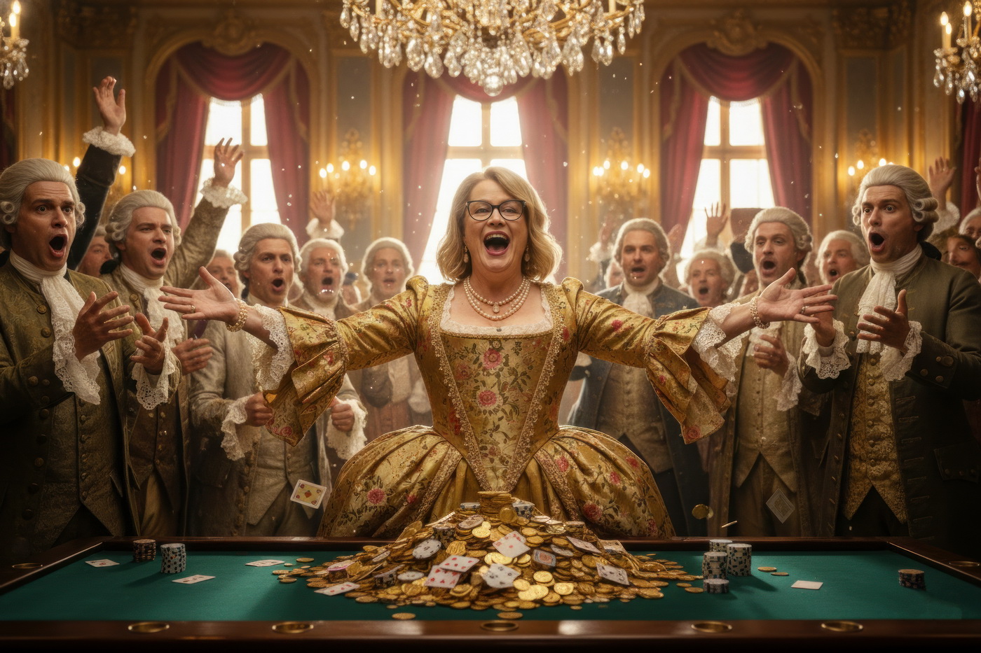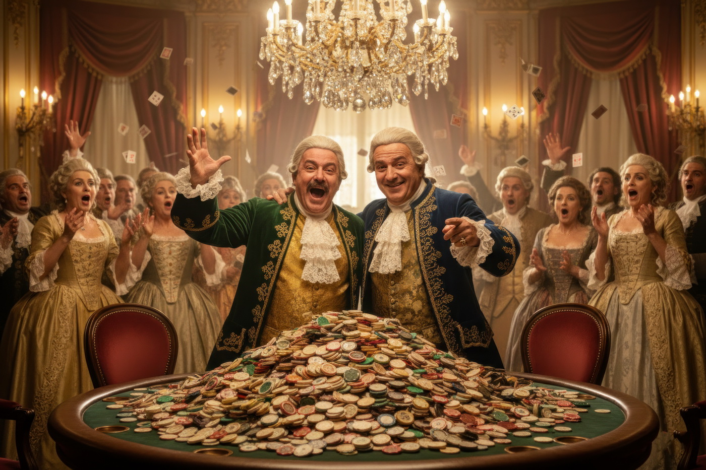 Apostar con peluca y cara de no haber roto un plato. Esto va de casinos pero con la estética de Barry Lyndon, o sea, mesas de juego en salones del siglo XVIII iluminados con velas, gente con pelucas empolvadas apostando fortunas como si fuera lo más normal del mundo y perdiéndolas con la misma calma elegante; el “protagonista espiritual” sería Redmond Barry, un tipo que sube y baja socialmente a base de cartas, suerte y bastante cara dura, y lo curioso aquí es el contraste: todo parece refinado y silencioso… pero en realidad es el mismo vicio de siempre, solo que con mejores modales y ropa mucho más incómoda.
