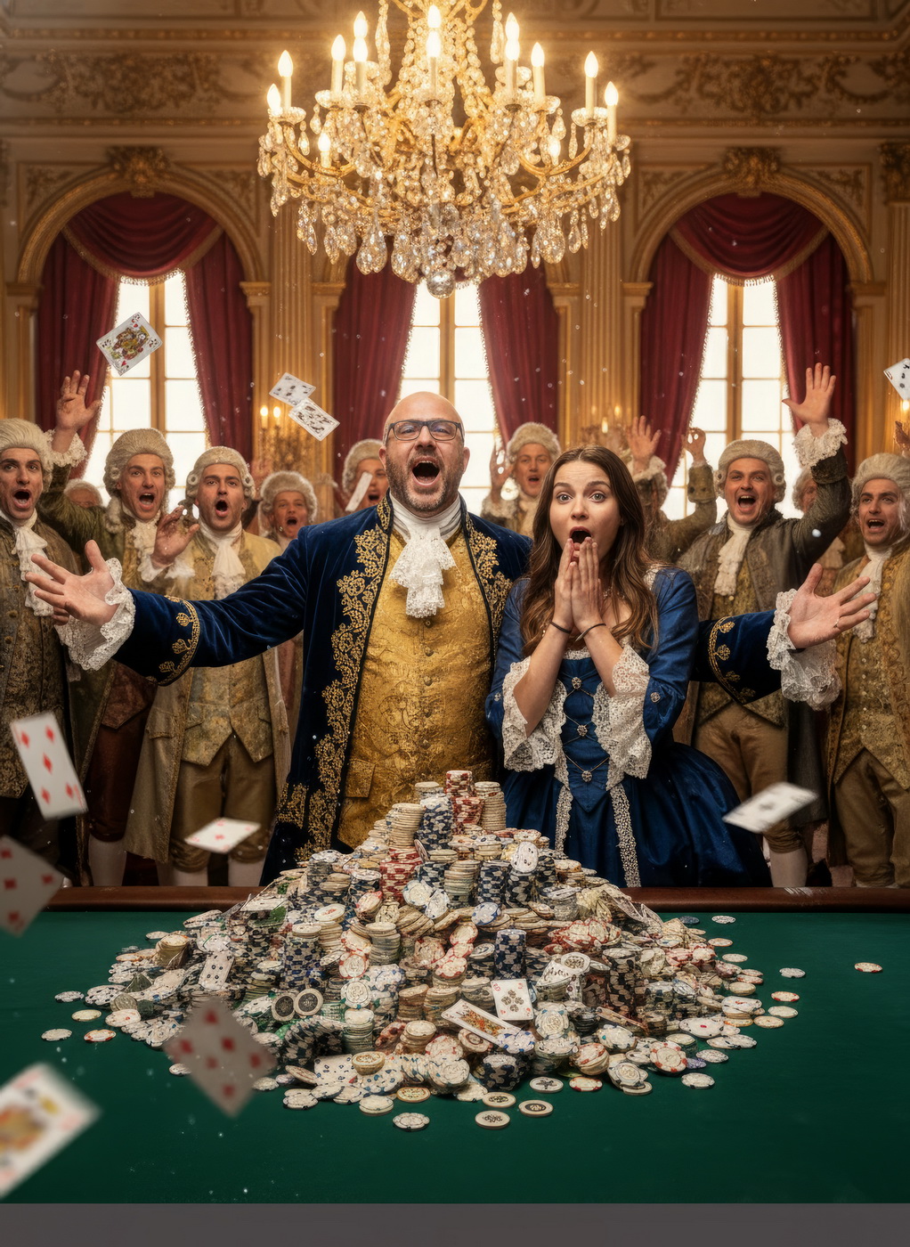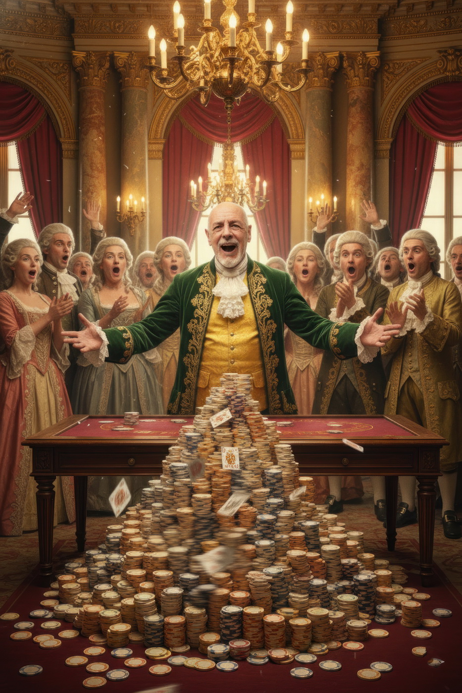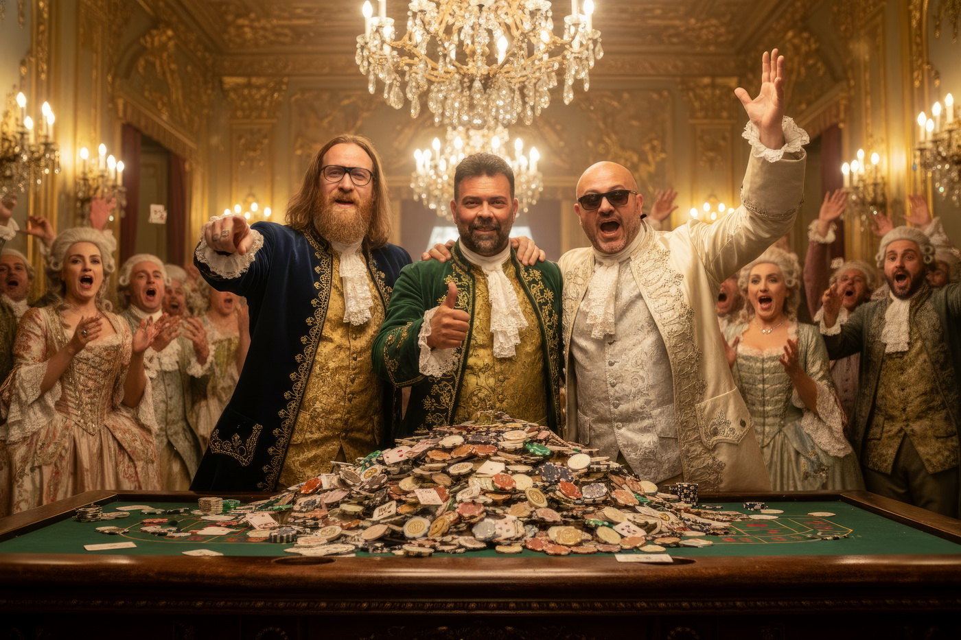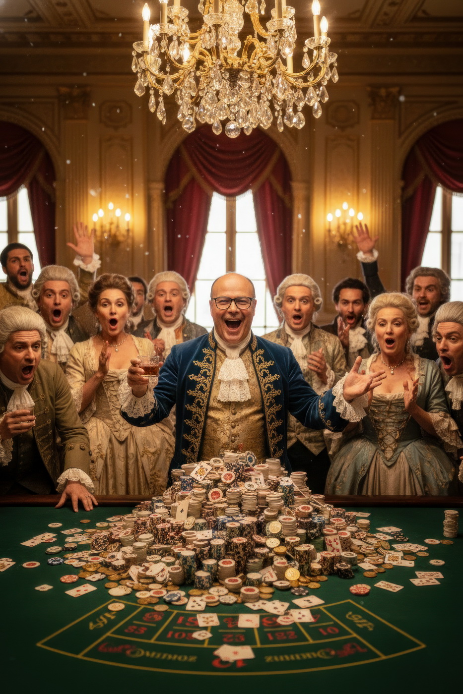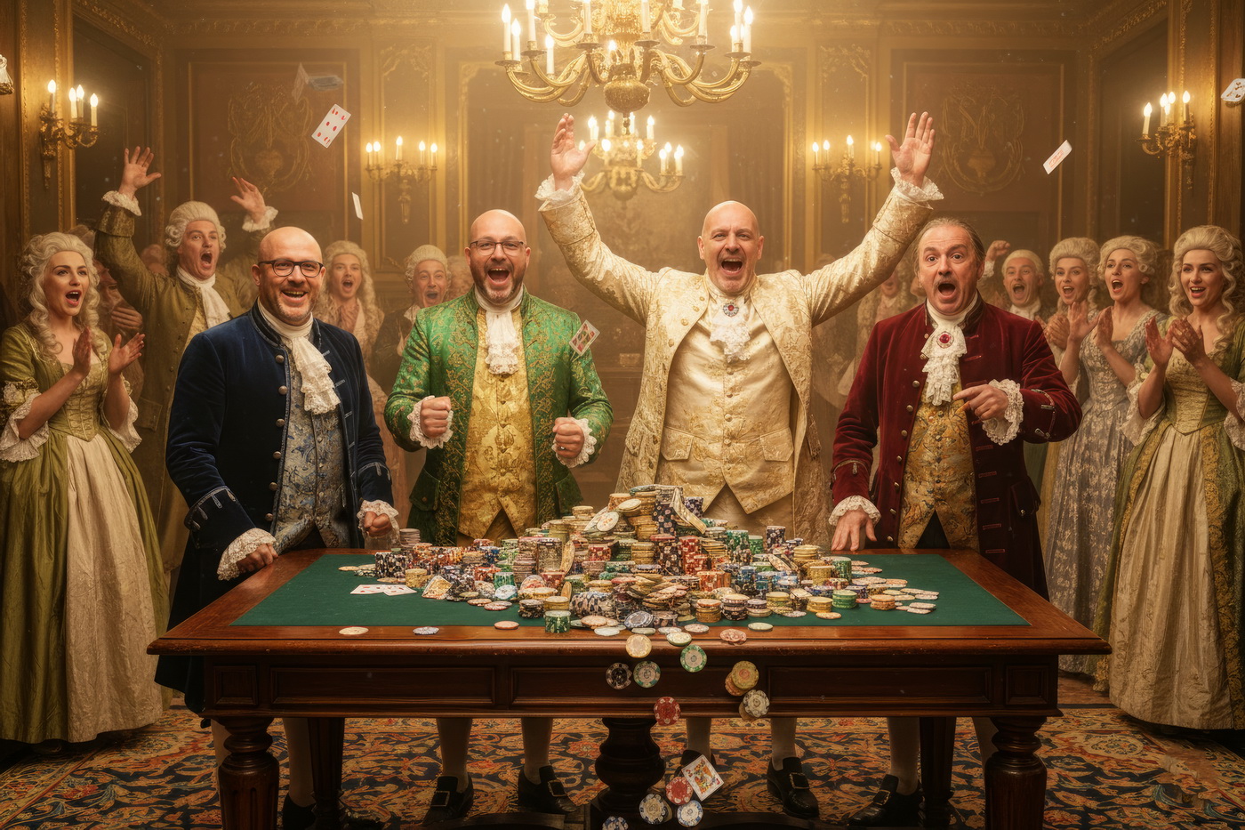 Apostar con peluca y cara de no haber roto un plato. Esto va de casinos pero con la estética de Barry Lyndon, o sea, mesas de juego en salones del siglo XVIII iluminados con velas, gente con pelucas empolvadas apostando fortunas como si fuera lo más normal del mundo y perdiéndolas con la misma calma elegante; el “protagonista espiritual” sería Redmond Barry, un tipo que sube y baja socialmente a base de cartas, suerte y bastante cara dura, y lo curioso aquí es el contraste: todo parece refinado y silencioso… pero en realidad es el mismo vicio de siempre, solo que con mejores modales y ropa mucho más incómoda.