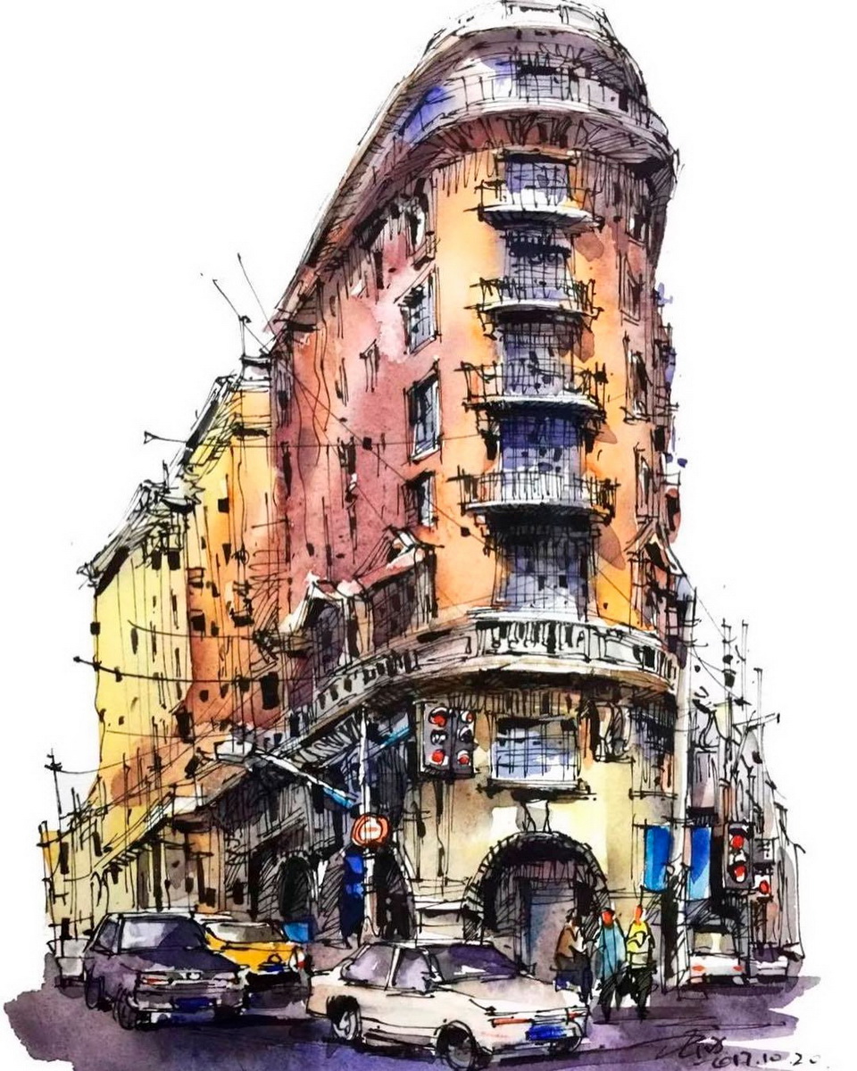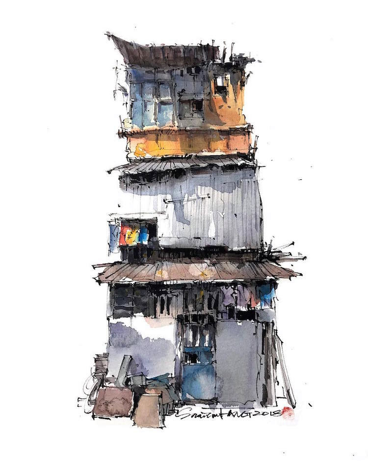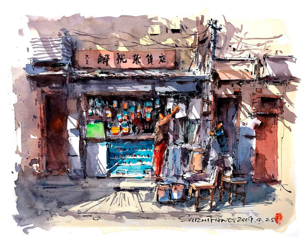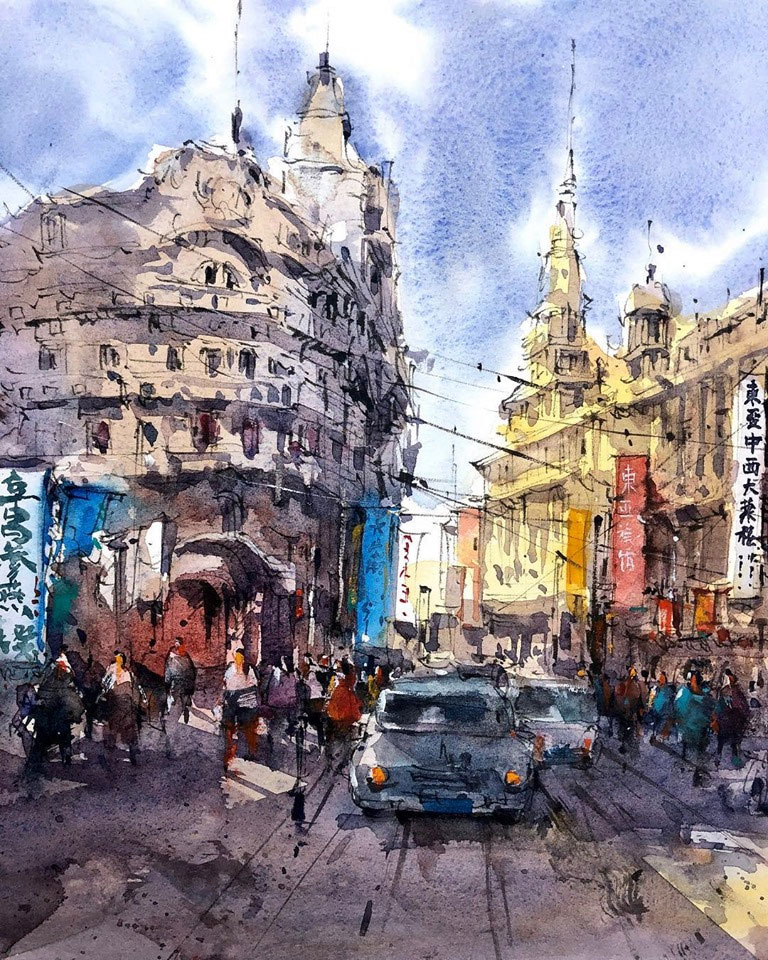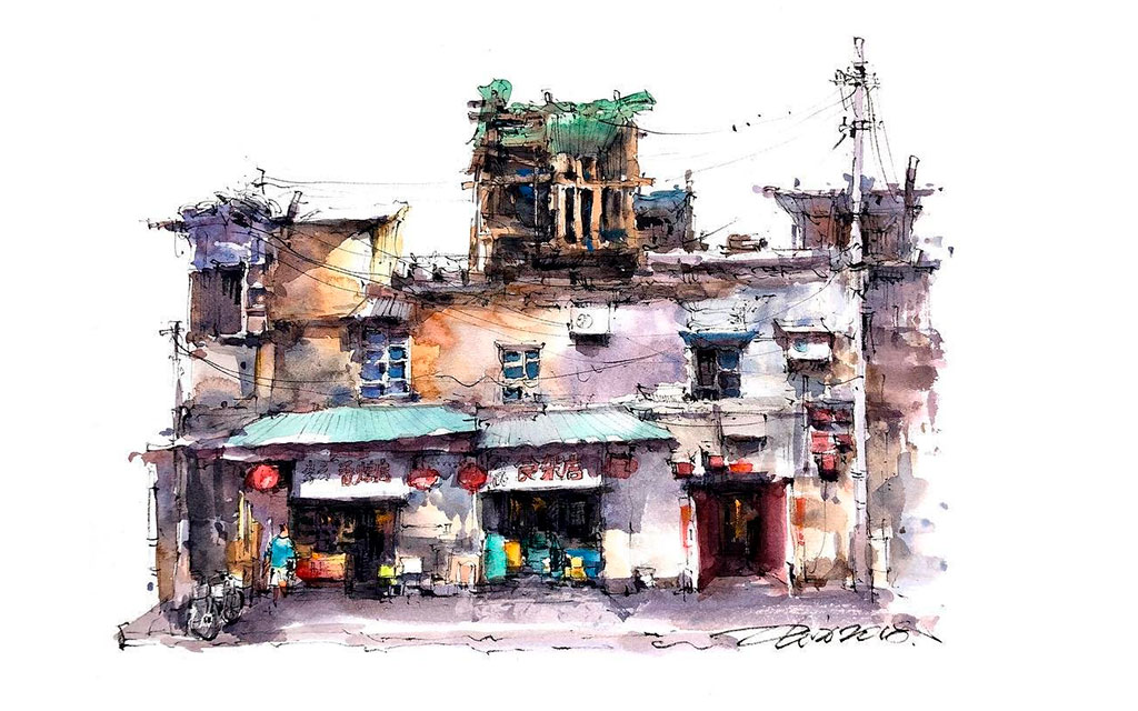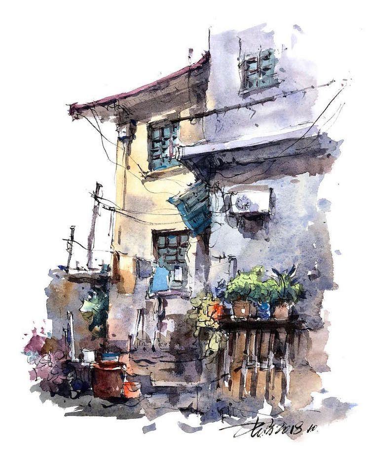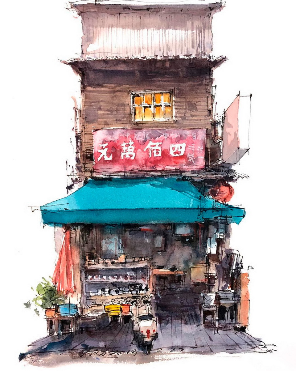 Estos dibujos urbanos en acuarela se han vuelto bastante populares entre los artistas viajeros, y Shi verdaderamente ha logrado perfeccionar este arte. Hechos de forma relajada y trabajando rápidamente para capturar detalles efímeros, Shi usa una pluma negra para trazar contornos y detalles antes de incorporar el color. Cada escena presenta el contraste perfecto entre luz y sombra, dando vida a los bocetos urbanos y estudios arquitectónicos del talentoso artista.