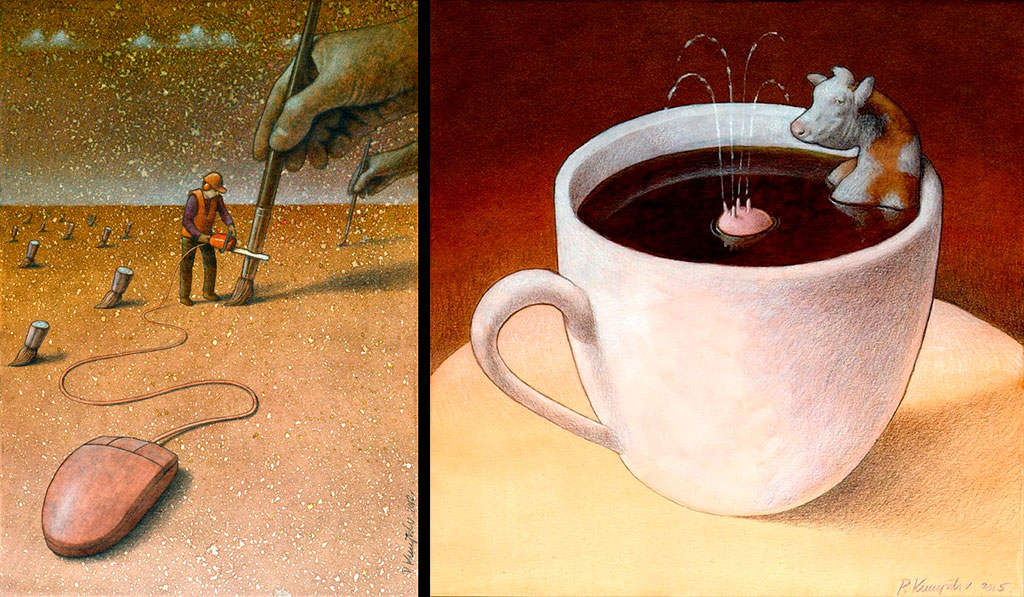 Pawel Kuczynski es un ilustrador nacido en 1976 en Szczecin, Polonia. Se graduó de la Academia de Bellas Artes de Poznan, con una especialización en gráfica. En el 2004 empezaría a realizar las ilustraciones que le llebarán a ganar 92 premios nacionales e internacionales en caricatura e ilustración, lo que le ha valido el premio “Eryk” de la Asociación de Ilustradores de Polonia, por un record de premios en competiciones internacionales. A través de ilustraciones satíricas, Pawel retrata la realidad social, política y cultural que se vive actualmente. Y aunque de primera impresión las imágenes parecerían cómicas, en realidad muestran algunos de los serios problemas que se viven en el mundo de hoy. Su trabajo se puede ver tanto en su web como en su página de Facebook.