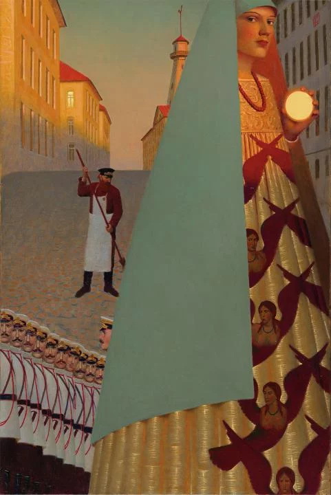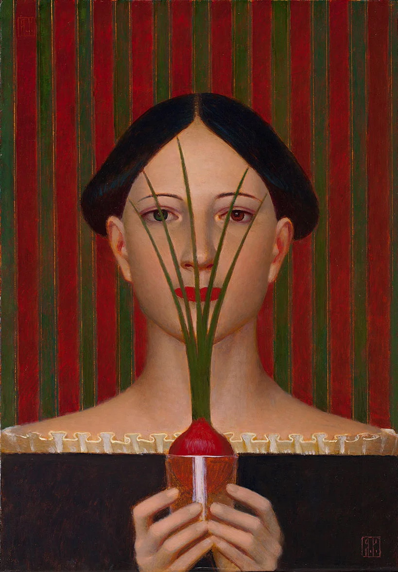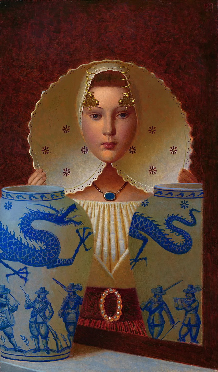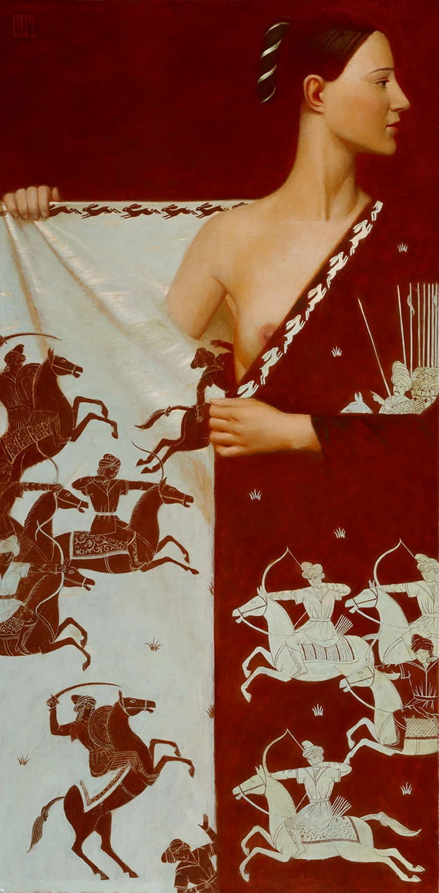 Andrey Remnev (1962) se pasó la juventud copiando a los antiguos maestros en los museos de Moscú. Su obra, profundamente rusa pero universal a la vez se inspira en toda la historia del arte de su país, desde los constructivistas a los iconos medievales rusos, y también la historia del arte universal (el Renacimiento italiano por ejemplo) consigue con ello una pintura atemporal y mágica.
