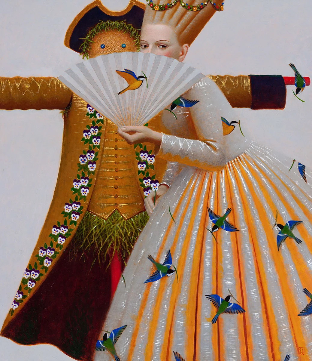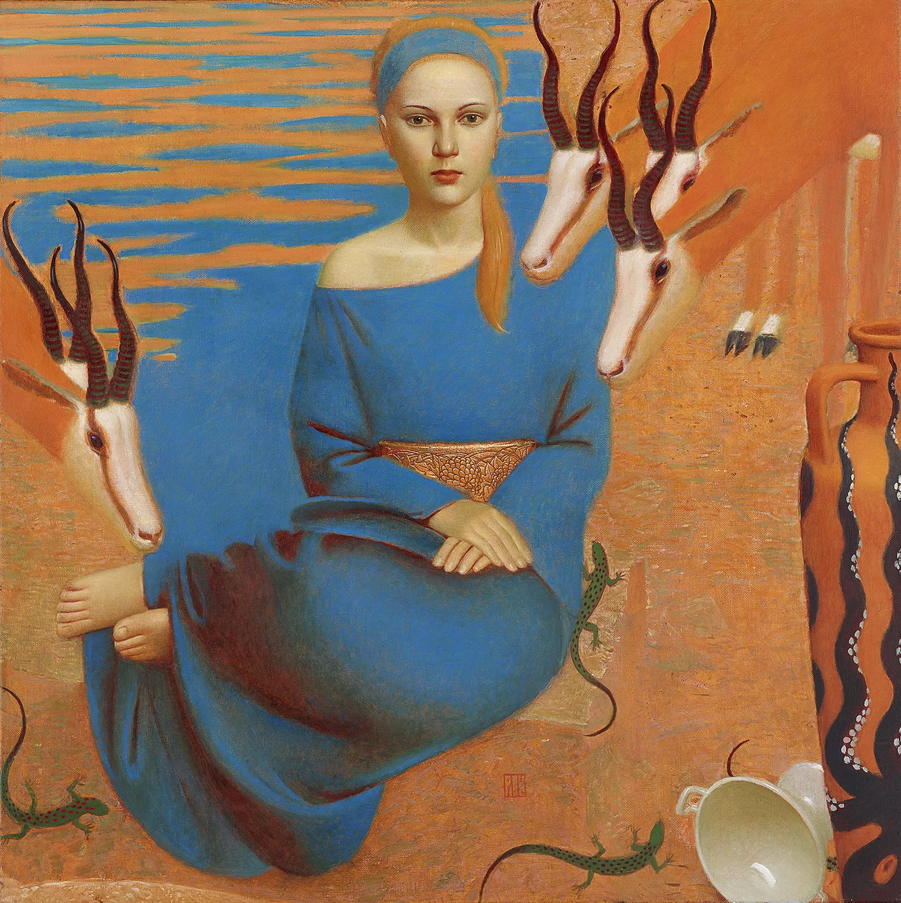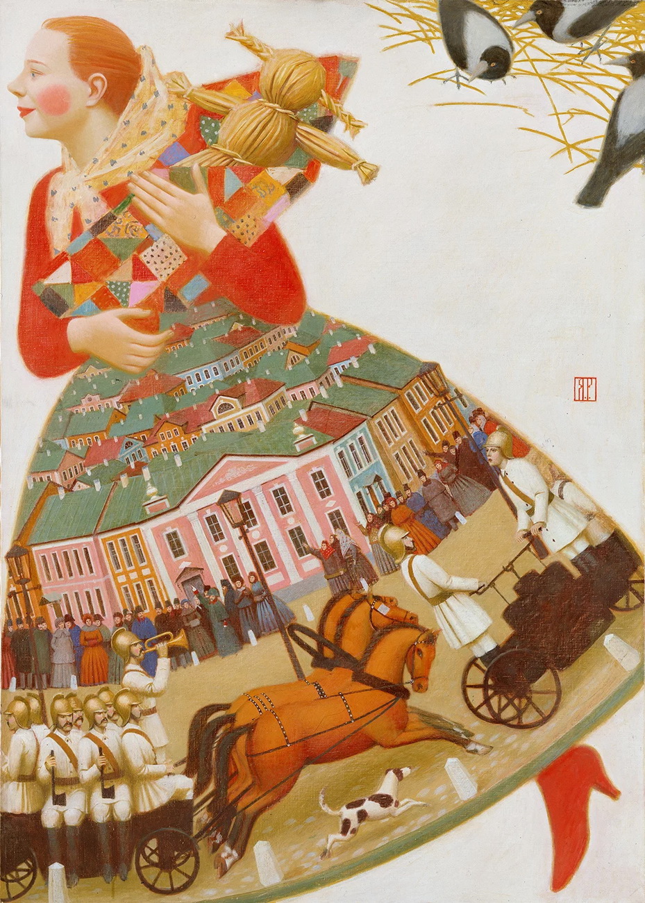 Andrey Remnev (1962) se pasó la juventud copiando a los antiguos maestros en los museos de Moscú. Su obra, profundamente rusa pero universal a la vez se inspira en toda la historia del arte de su país, desde los constructivistas a los iconos medievales rusos, y también la historia del arte universal (el Renacimiento italiano por ejemplo) consigue con ello una pintura atemporal y mágica.