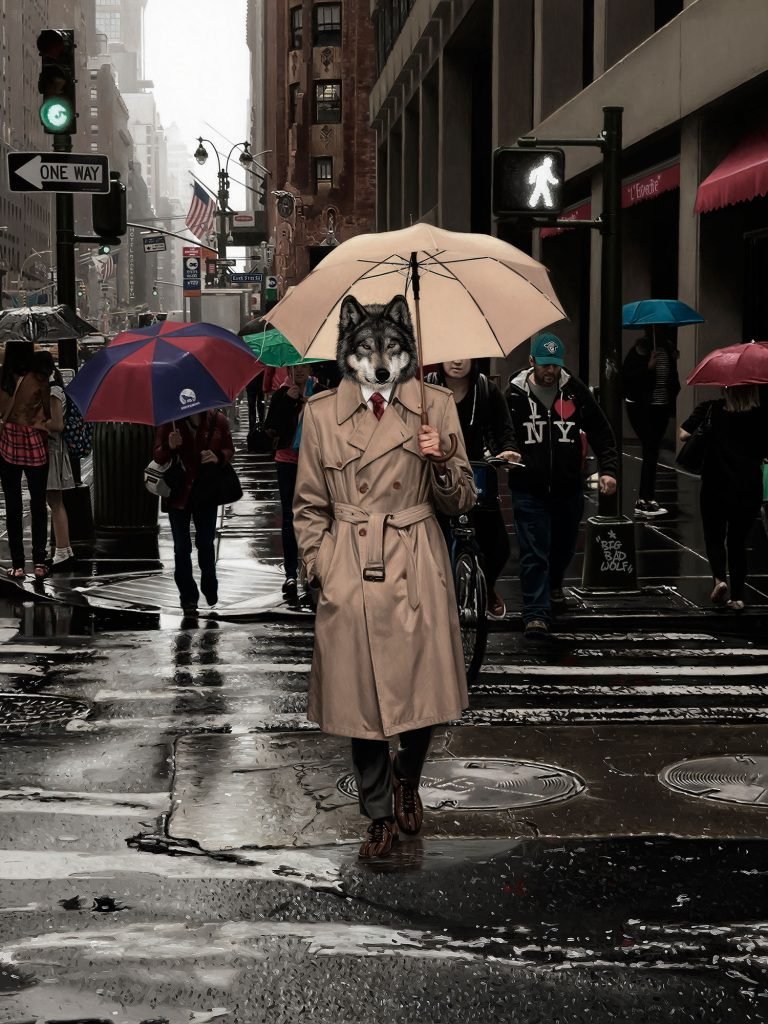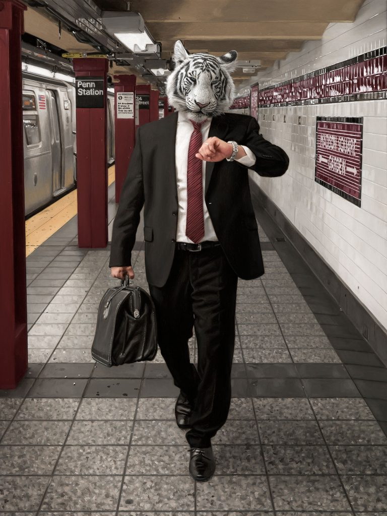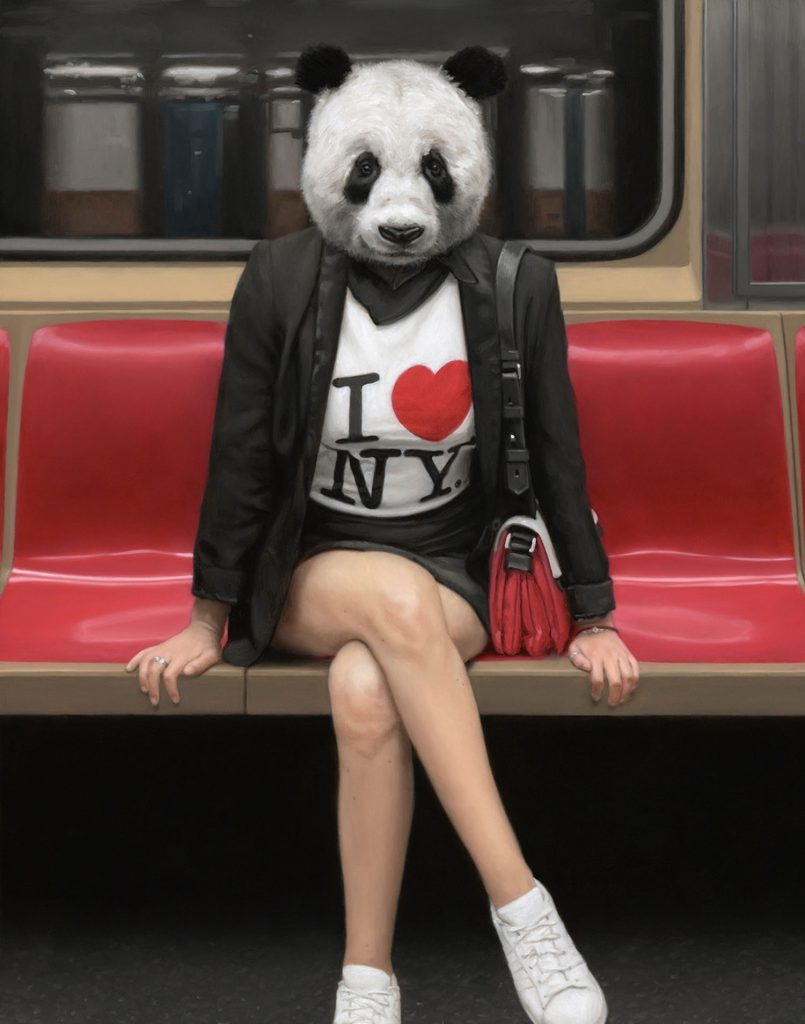 Sin embargo, no son simples pinturas y retratos de personas en estos ambientes., ya que yuxtapone animales con cuerpos humanos, sacándolos de su entorno natural. Es decir, fusiona un poco de la naturaleza con el mundo urbano.