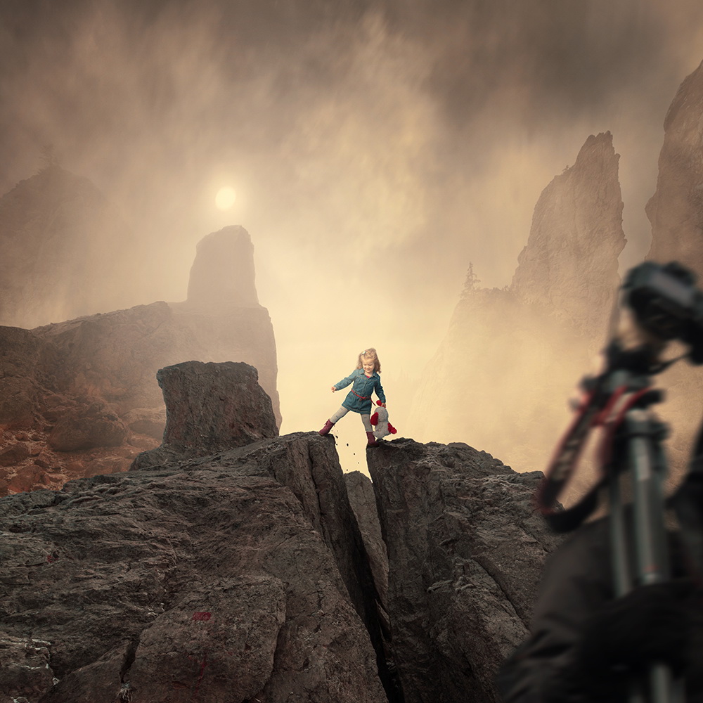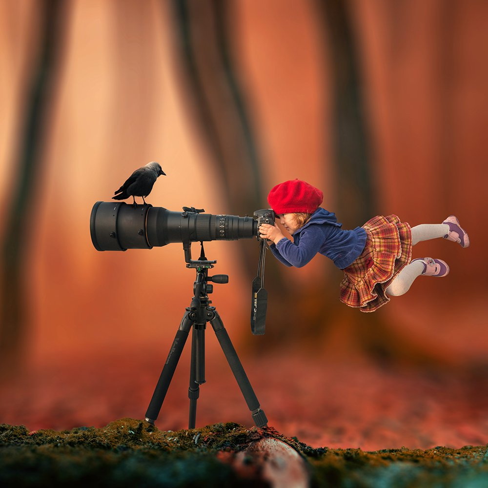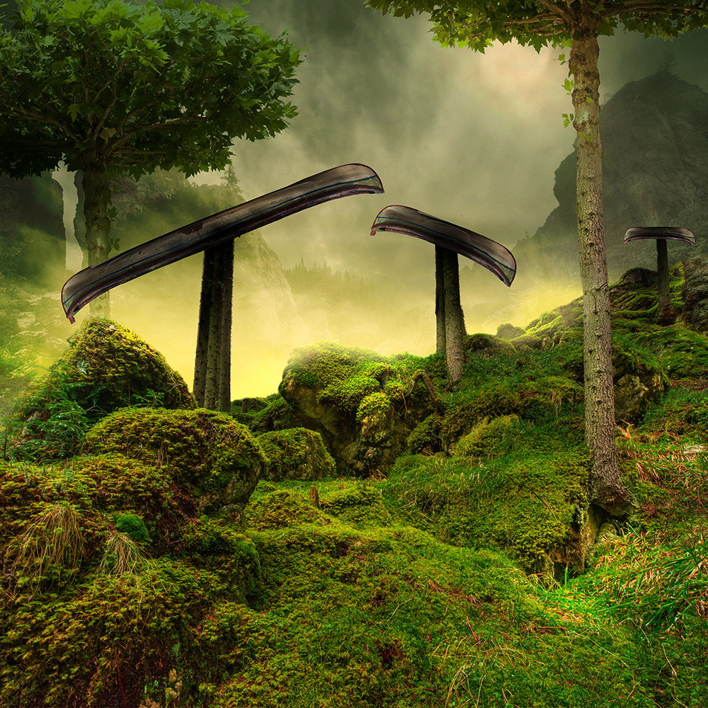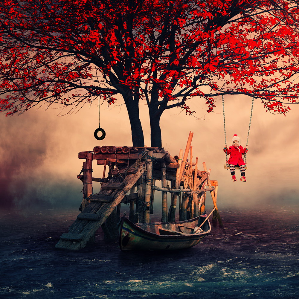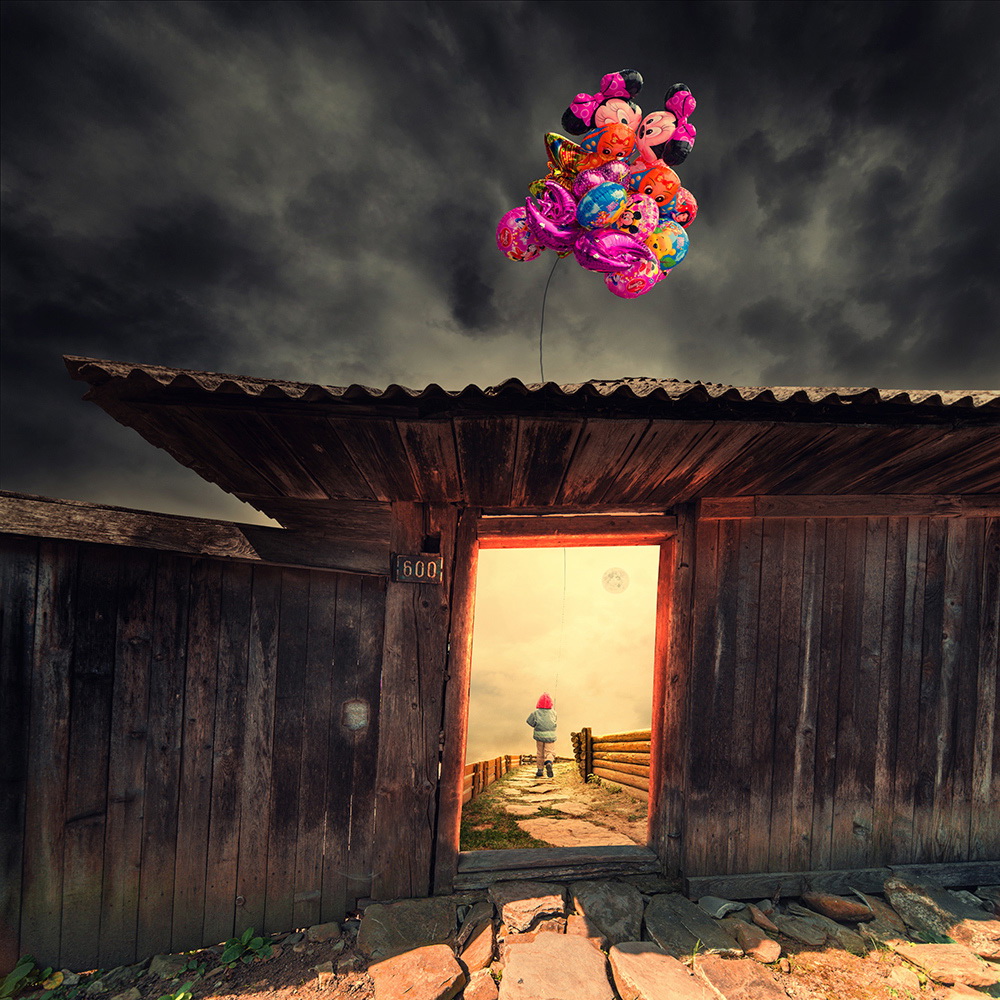 Comenzando con una imagen normal como punto de partida, Ionut, mezcla lo ordinario con lo extraordinario convirtiendo una simple escena de una muchacha pescando en un lago, en una imagen sorprendente de una niña cabalgando un enorme pez o las astas de un ciervo que se transforman en un par de árboles con aves volando entre las ramas.
