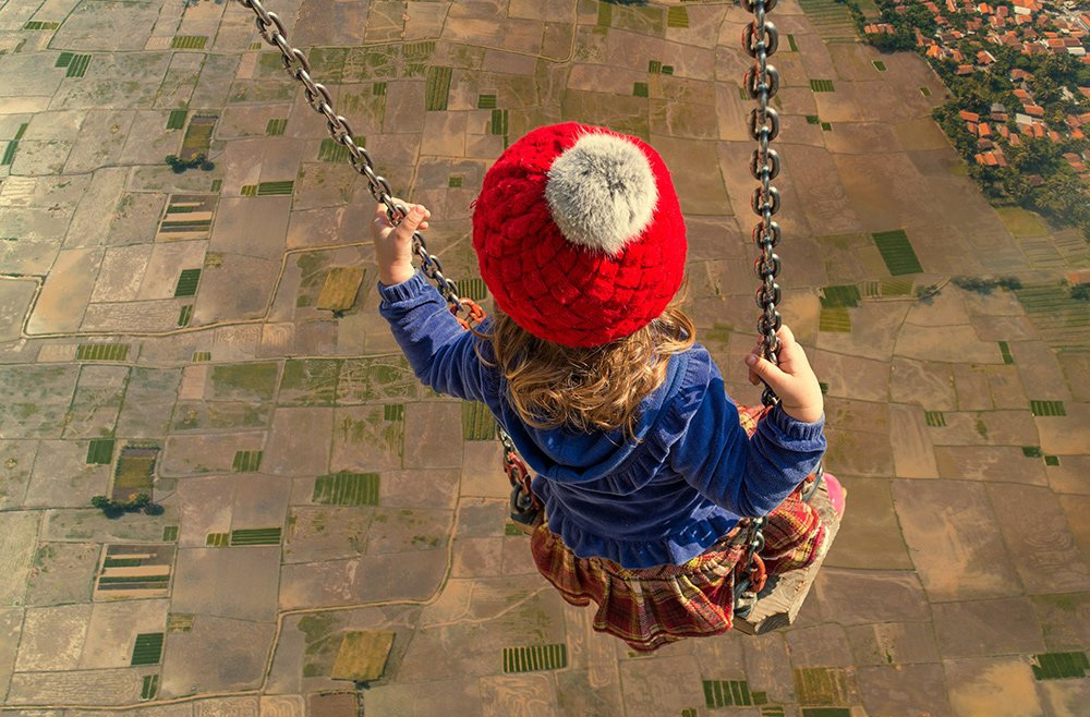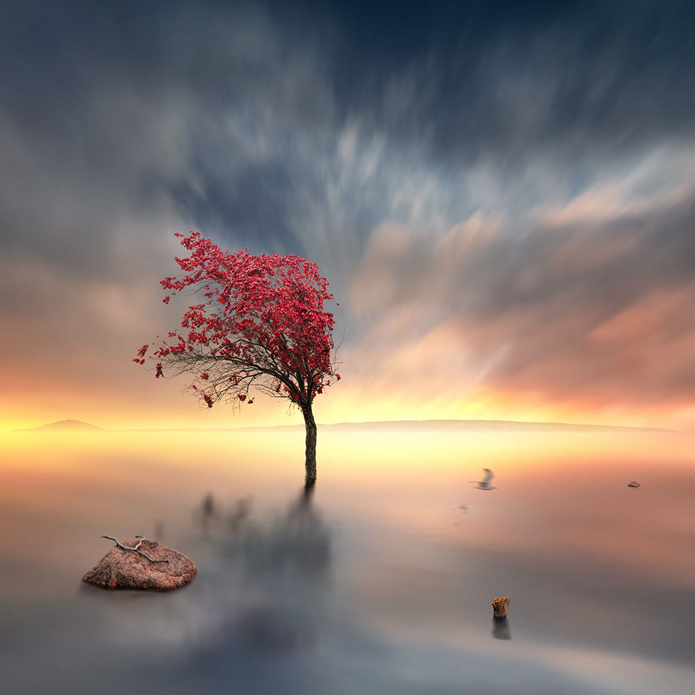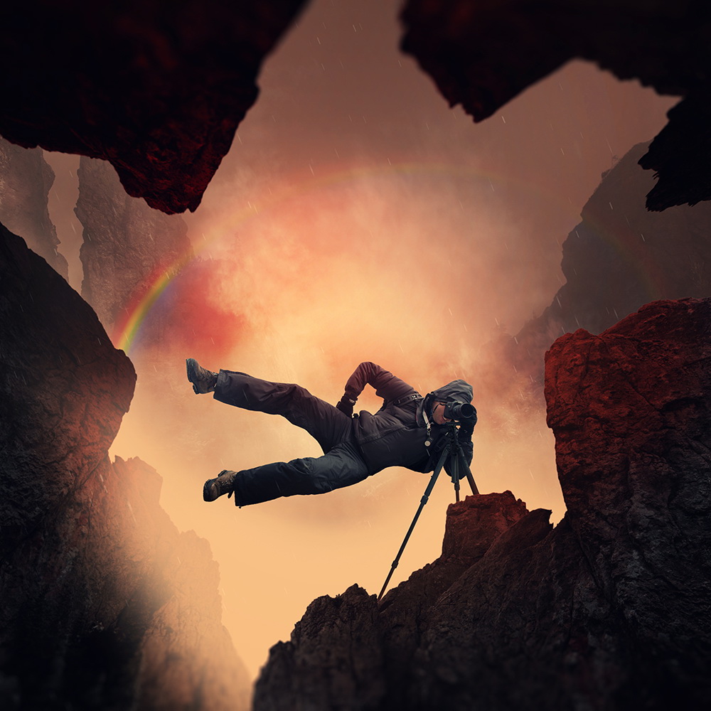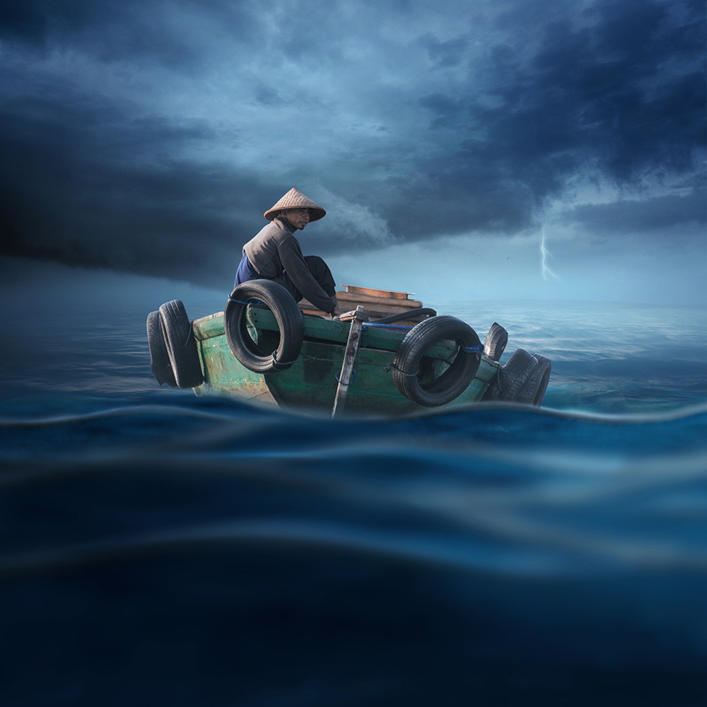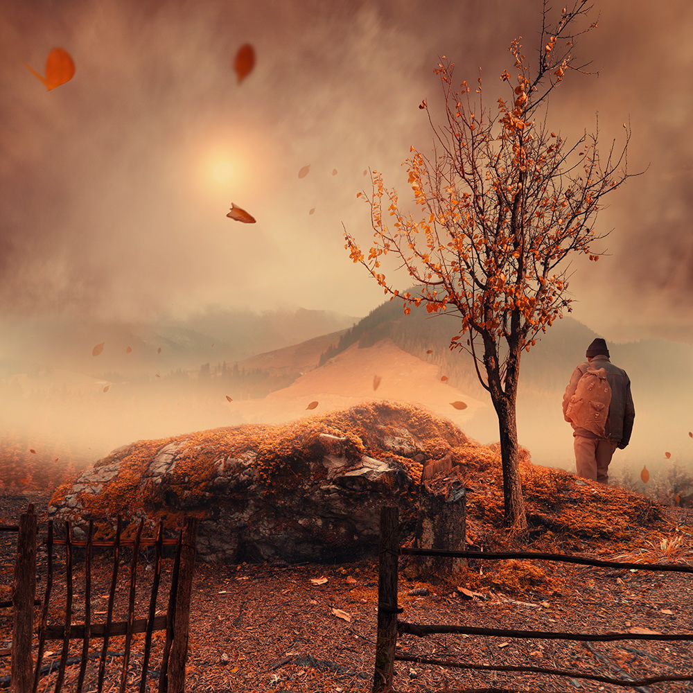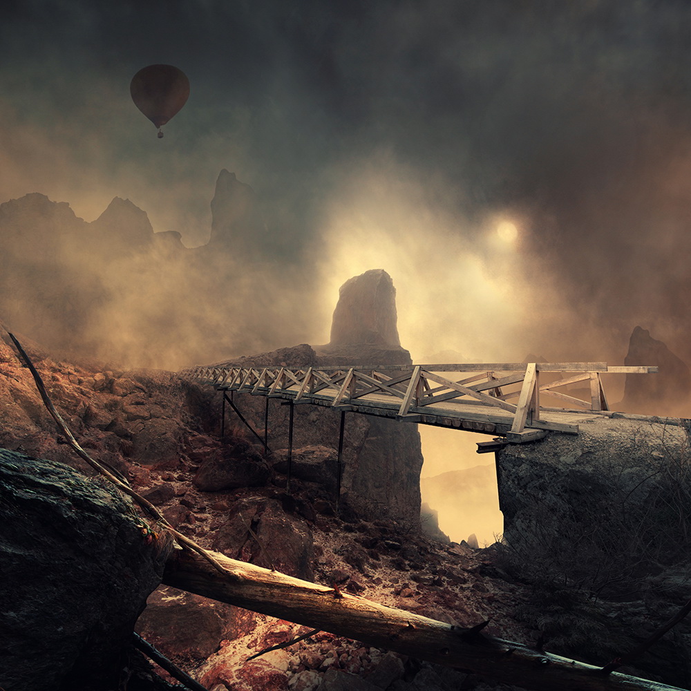 Comenzando con una imagen normal como punto de partida, Ionut, mezcla lo ordinario con lo extraordinario convirtiendo una simple escena de una muchacha pescando en un lago, en una imagen sorprendente de una niña cabalgando un enorme pez o las astas de un ciervo que se transforman en un par de árboles con aves volando entre las ramas.