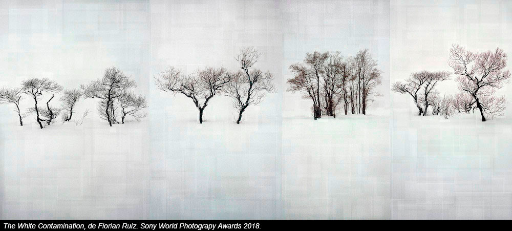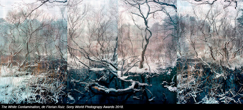 El francés Florian Ruiz capturó las montañas nevadas de Fukushima (Japón) para su trabajo "The White Contamination", donde retrata "el dolor invisible" de la contaminación. Juega con las transparencias, la composición rota y el efecto de vibración para tratar de recrear el efecto que percibió cuando allí mismo midió el nivel de radioactividad con un contador Geiger.