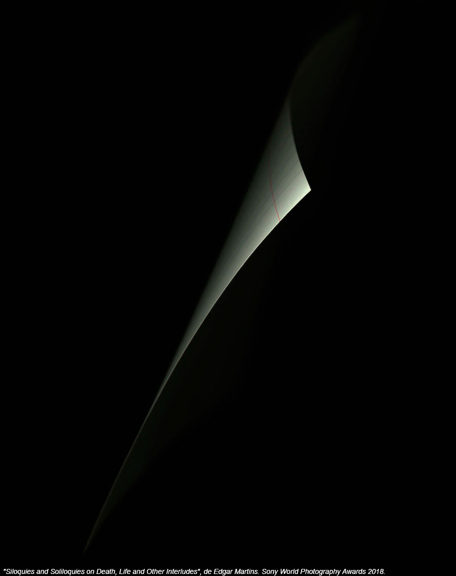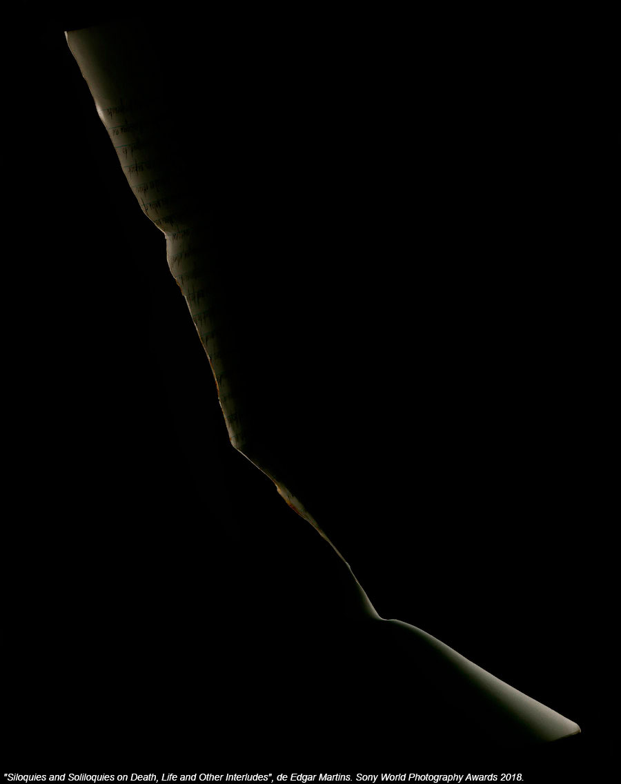 El portugués Edgar Martins ha vencido en la categoría Naturaleza muerta con "Siloquies and Soliloquies on Death, Life and Other Interludes". Se ha producido en el Instituto de Medicina Legal y Ciencias Forenses de Portugal, usando cartas de suicidio y otros objetos empleados en crímenes. Martins ha querido introducir la fotografía en un campo con un carácter tan marcadamente científico para cuestionar estas pruebas desde varios puntos de vista, incluido el psicológico o el semántico.