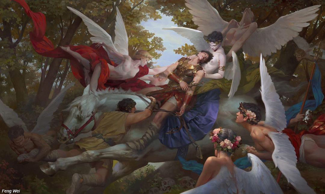Sus sonidos eran apacibles y su respiración acompasada a los latidos de su corazón, se deslizaba con lentitud por entre las enredaderas de pino, su ala estaba manchada de sangre y bañaba su inmaculada piel blanca. Emitió un gruñido, al tiempo que se dejo caer sobre la maleza, cerrando sus ojos, dejando que el ensordecedor ruido de la batalla se perdiera en el infierno y que solo el sonido del viendo se escabullera con él.