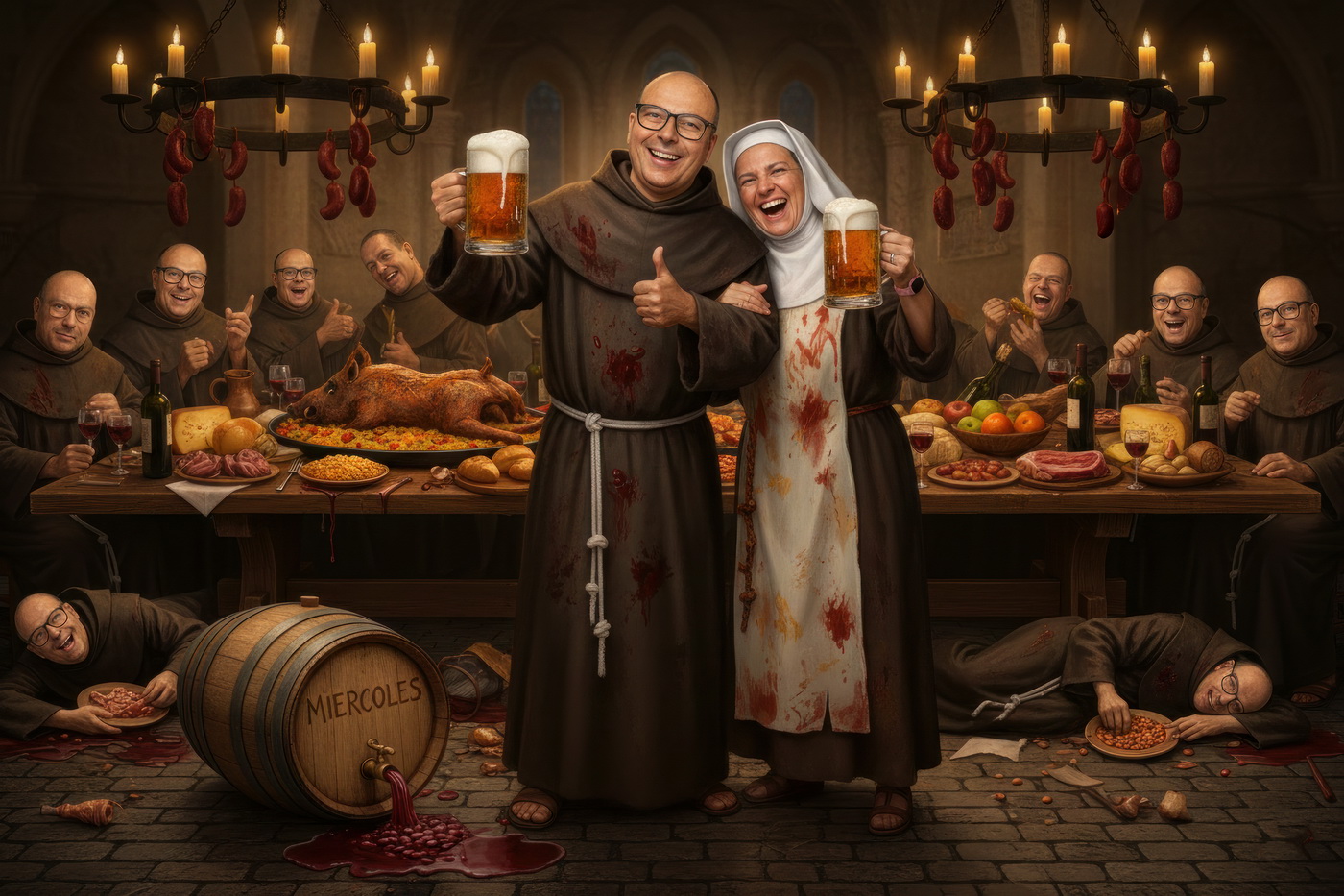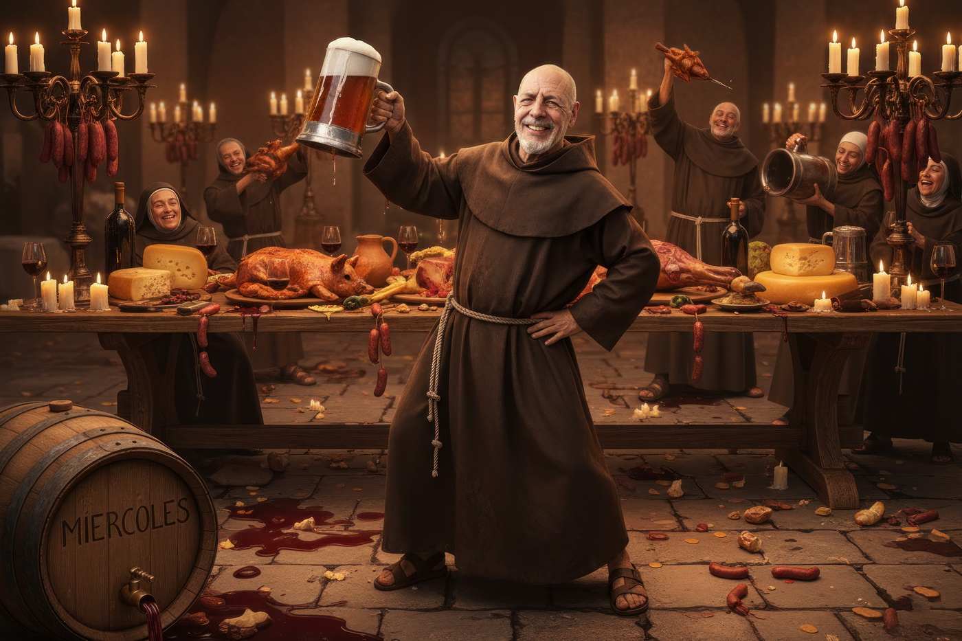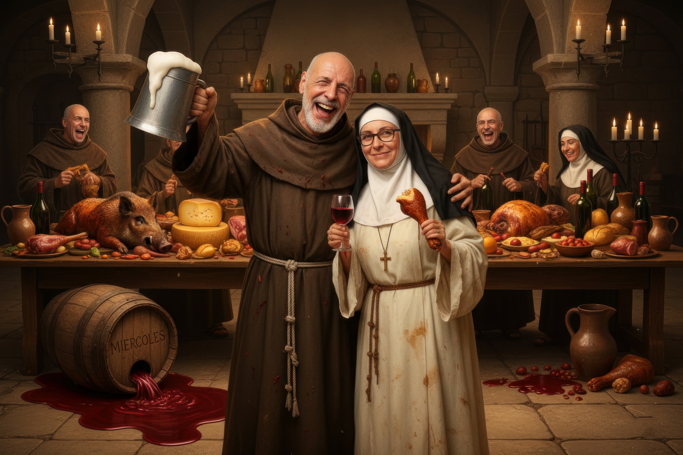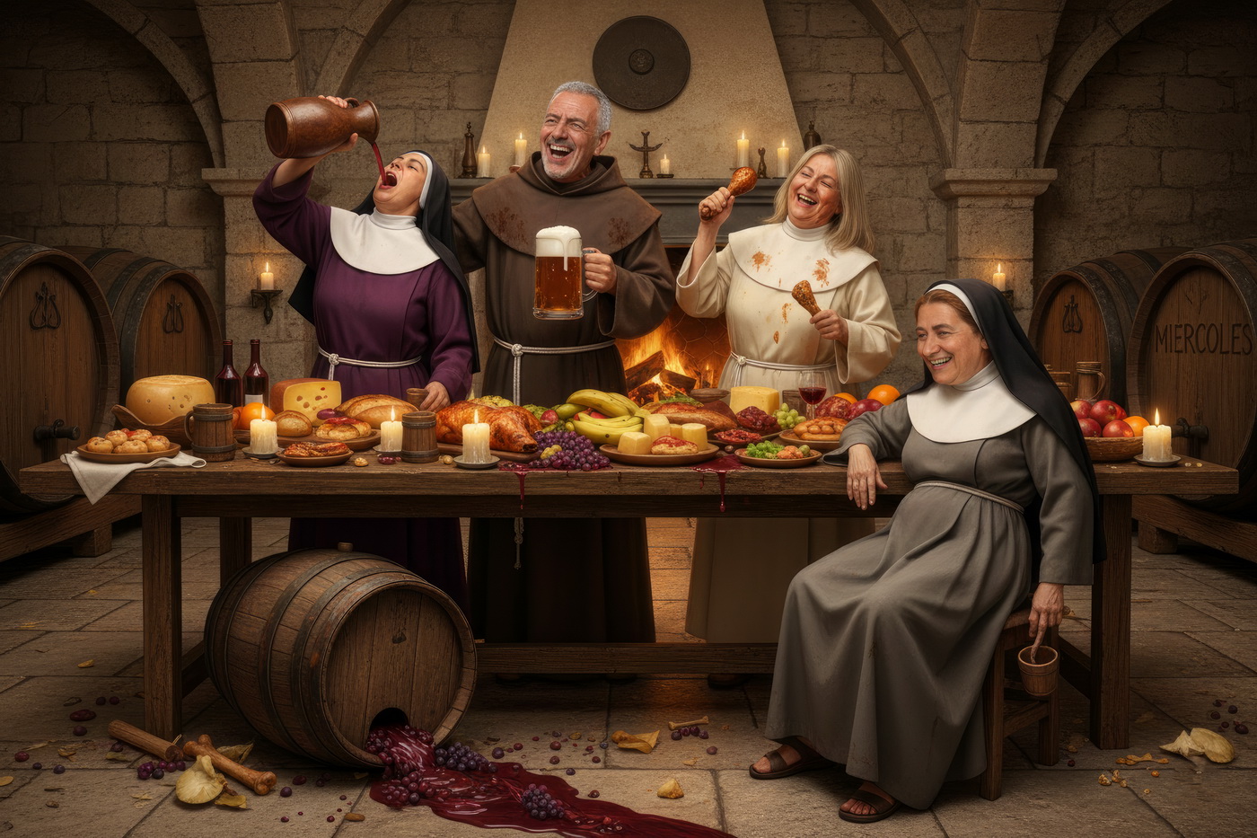 A lo largo de la historia, especialmente en la Edad Media y parte de la Edad Moderna, hubo sectores de la Iglesia —sobre todo en altos cargos— que llevaban un estilo de vida bastante más cercano al banquete que a la austeridad: mesas llenas de carne, vino en abundancia y celebraciones que se parecían más a fiestas nobles que a retiros espirituales; muchos monasterios y abadías acumulaban riqueza y tierras, lo que facilitaba ese nivel de vida, y no era raro que se criticara internamente ese exceso, porque contrastaba bastante con la idea de humildad que se predicaba; de hecho, estas prácticas fueron uno de los motivos de reformas dentro de la propia Iglesia, ya que mientras algunos vivían con disciplina estricta, otros claramente entendieron el voto de pobreza como algo… bastante flexible.